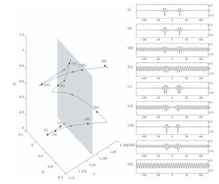 Working with Ricardo Barros (Loughborough), Paul Milewski (Penn State), and Wooyoung Choi (NJIT), we have been looking at the global bifurcation structure of three-layer mode-1 internal solitary waves. Through critical point analysis of an asymptotic model to the full Euler equations, we are able to separate regions of parameter space where there exist either depression or elevation waves, or both. The story is very rich, the spontaneous emergence of critical points being the complicating factor, resulting in interesting solutions such as pyramidal solitons.
