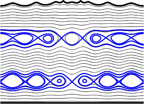 While co-supervising Jonty Sewell’s PhD, alongside Miles Wheeler and Karsten Matthies, we looked at the global bifurcation of waves propogating at a vorticity interface. Near-limiting profiles were recovered, and surprisingly a complete sweep of parameter space revealed no overhanging streamlines!